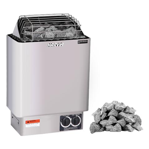The Harvia KIP 8kW Sauna Heater Package with Built-In Controls comes complete with the KIP80B Sauna Heater and Sauna Stones. This traditional stainless steel heater has a dual wall construction that allows the exterior to remain cool to the touch and heats up fast in sauna rooms from 250 to 425 cubic feet (CF).