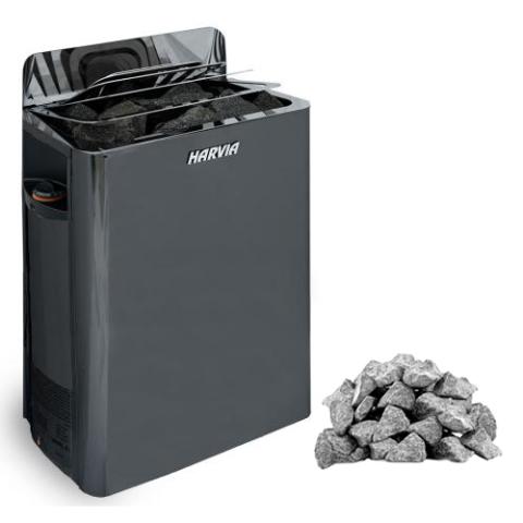 The Wall 8kW Sauna Heater Package with Built-In Controls by Harvia comes complete with The Wall SW80 Sauna Heater and Sauna Stones. This compact heater package combines modern design with flexible installation options, providing improved air circulation and steady warmth in sauna rooms from 177 to 431 cubic feet (CF).