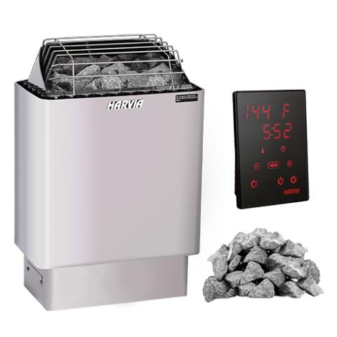The Harvia KIP 8kW Sauna Heater Package comes complete with the KIP80W Sauna Heater, Xenio Wi-Fi Control, and Sauna Stones. This traditional stainless steel heater has a dual wall construction that allows the exterior to remain cool to the touch and heats up fast in sauna rooms from 250 to 425 cubic feet (CF).