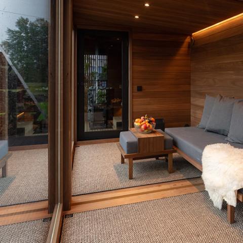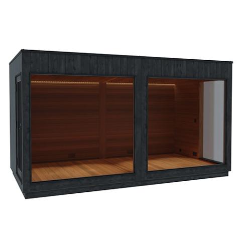 The Nordic Misty XL 2-Entrance Lounge is a fully enclosed, pre-wired outdoor module that can function as a standalone retreat or connect with additional Nordic Misty modules.