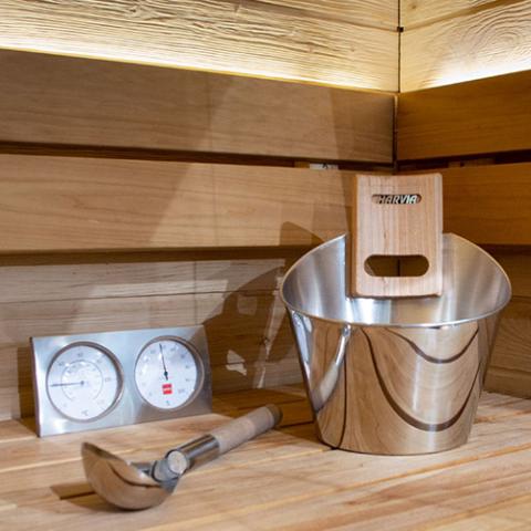 Add the finishing touches to your stylish sauna space with the Harvia Sauna Accessory Set, constructed from high-quality stainless steel that easily withstands fluctuating temperatures for long-lasting, heavy-duty use.