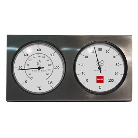 - Easy-to-read gauge cluster with white faces that precisely measure sauna temperature and humidity.