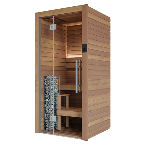 The up to 4-person Auroom Cala Glass DIY Sauna Cabin Kit is a comfortable, spa-quality home sauna. With its straightforward, simple setup and low energy demands, it's easy to use and cost-effective to run. Featuring a beautiful glass front wall and door, the Cala is a small indoor sauna kit with impeccable attention to detail.